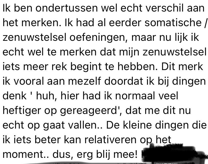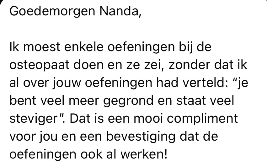 Ik kwam bij jou terecht omdat ik echt niet meer wist hoe ik me weer "vrij" en "in het moment" kon voelen. Mijn hypochondrische gedachten namen zo de overhand dat echt genieten niet meer lukte. Altijd weer de angst om ziek te worden. Verschrikkelijk!! Dit was een struggle waar ik al meer dan 10 jaar mee bezig was. Verschillende therapieën, gesprekken en trajecten gevolgd maar niet hielp.Op Instagram had ik al eens het èèn en ander voorbij zien komen van jou en op het moment dat ik echt heel diep zat heb ik contact met jou gezocht. Een stap die ik dus echt jaren eerder had moeten zetten! Je luisterde, prikkelde me en gaf me de juiste oefeningen mee! Aan deze oefeningen en jouw woorden, daar houd ik me nog steeds aan vast. Elke avond doe ik de oefeningen en als ondersteuning maak ik dankbaar gebruik van online cursus. Dit is gewoon ook heel fijn als naslagwerk.Iedereen die zo in de knoop zit met zichzelf raad ik aan om met jou in contact te komen. Want zoals ik me nu voel gun ik iedereen! Dankjewel, lieve Nanda! Je bent een topper!!